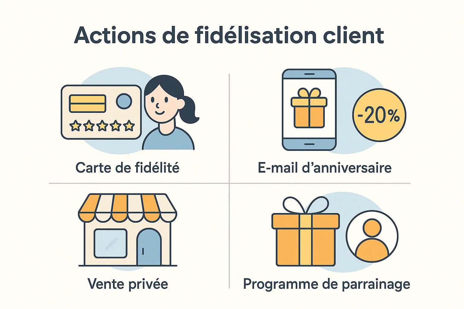 Des exemples concrets d'actions de fidélisation de la clientèle permettent de mieux voir comment le puzzle de la fidélisation se met en place. La carte de fidélité a été popularisée en France par la Fnac. Le principe est simple : à chaque achat, le client cumule des points qu’il peut ensuite échanger contre des réductions, des cadeaux ou d'autres avantages. Le but est de faire revenir les clients en magasin. Si au départ les cartes étaient souvent en papier, elles sont aujourd'hui remplacées par des cartes digitales beaucoup plus performantes. Les ventes privées sont des promotions réservées aux clients inscrits au programme de fidélité. Elles ont souvent lieu avant les soldes ou à des moments stratégiques de l’année, créant un sentiment d’exclusivité et de privilège. Cette stratégie renforce l’engagement des clients et stimule les achats anticipés. Les ventes flash sont des opérations limitées dans le temps (quelques heures ou quelques jours) avec des remises exceptionnelles. Elles génèrent un sentiment d’urgence chez les consommateurs et peuvent être utilisées pour dynamiser les ventes ou écouler rapidement un stock. Le bouche-à-oreille reste d'une efficacité redoutable. Surtout qu'il est aujourd'hui démultiplié avec les réseaux sociaux. Avec un programme de parrainage bien pensé, vos clients deviennent vos meilleurs ambassadeurs. La bonne approche est de valoriser la recommandation naturelle, sans jamais la forcer. Connaissez-vous les petites attentions qui font la différence ? Un retrait en 1h, un emballage cadeau gratuit ou encore un SAV aux petits soins. Fidéliser, c’est aussi miser sur ce que vos clients aiment déjà chez vous. C'est très difficile de proposer un service de qualité dans la durée, et cela fait la différence. Attention : Veillez à servir tout en étant rentable. Il ne s'agit pas de proposer des services gratuits sans rien en échange. Les techniques de marketing par SMS et E-mails sont très efficaces. Nous vous invitons à lire notre nombreuse documentation sur notre blog Carte Fidélité Facile. On peut combiner ces techniques pour rappeler le départ des ventes privées ou la deuxième démarque des soldes. Une newletter permet de se rappeler à ses clients, et c'est un des objectifs de tout bon programme de fidélité. Les réseaux sociaux permettent de créer du lien autrement avec ses clients. Beaucoup de commerces indépendants éprouvent des difficultés face à ces nouveaux modes de communication. Toutefois, utiliser les réseaux sociaux est une bonne idée d'action de fidélisation. Les plus populaires sont Instagram, Facebook, ou même Discord pour créer des espaces où vos clients se sentent écoutés, inspirés et impliqués. Une communauté engagée, c’est une fidélité naturelle, organique. Les tirages au sort et jeux-concours sont très populaires. Par expérience, nous savons que leur intérêt réside plus dans la collecte de données que la création directe d'un lien entre le joueur et l'entreprise. Exemple : un supermarché collecte les adresses de ses clients avec un jeux-concours à la sortie des caisses.